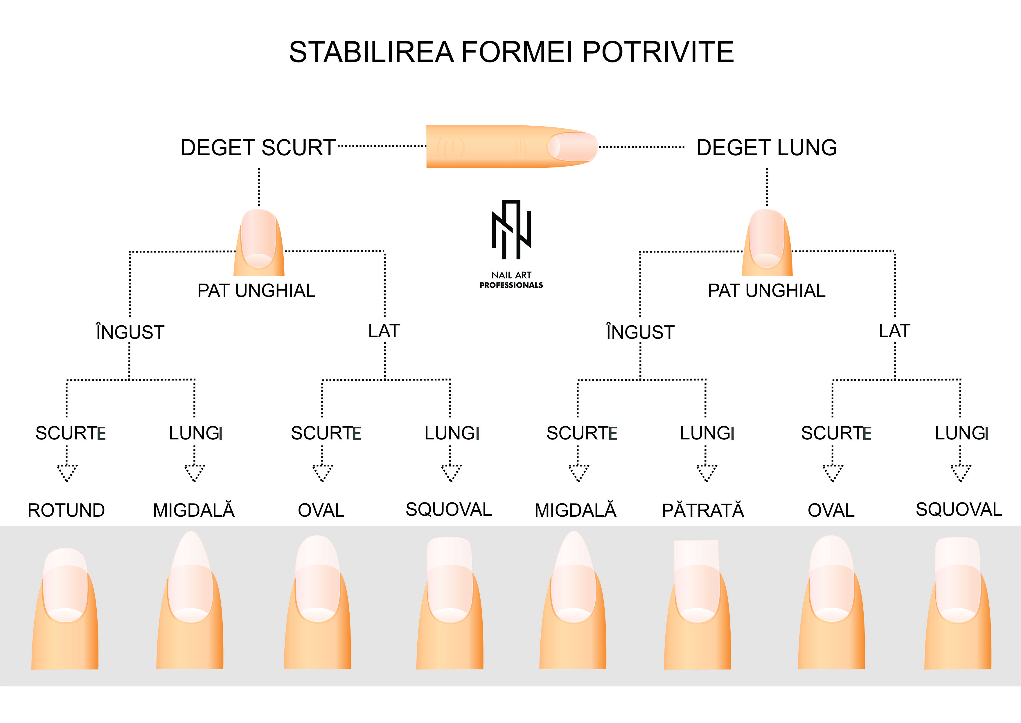 Pentru alegerea celei mai potrivite forme pentru cliente, in functie de lungimea degetelor si a unghiilor si formei patului unghial, va sfatuiesc sa tineti cont de diagrama de mai jos.